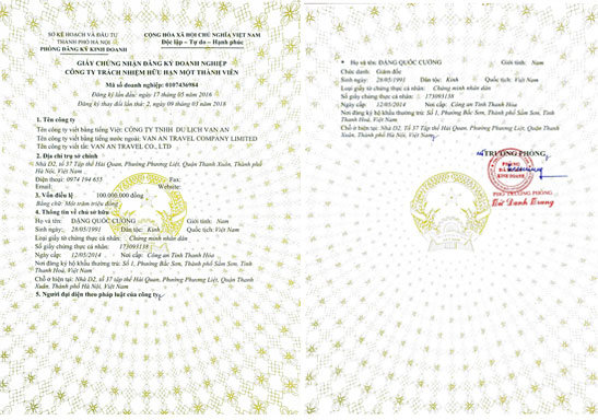 Giấy chứng nhận đăng ký doanh nghiệp Công ty TNHH Du lịch Vạn AN